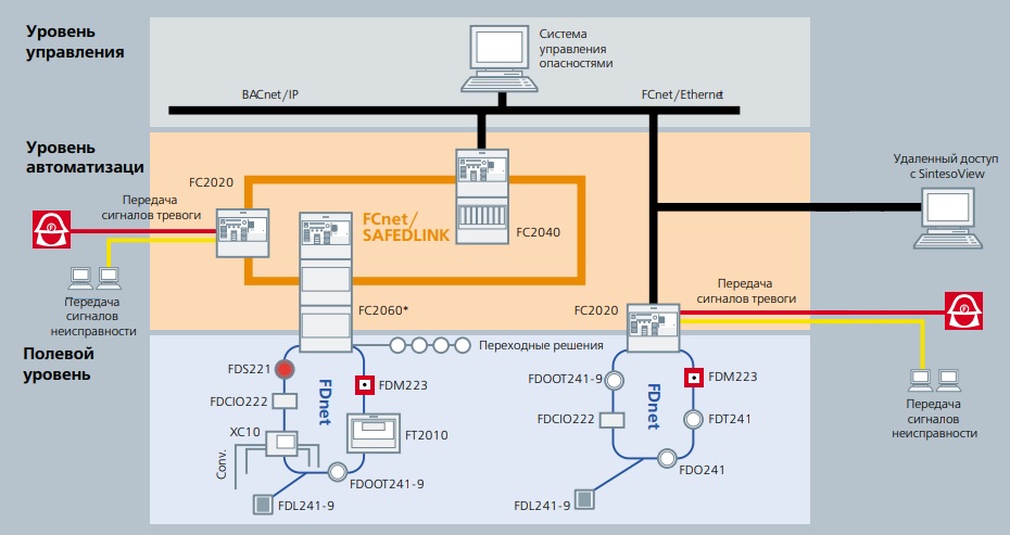 Sinteso™ предлагает две мощные сети – FCnet и FDnet. В сеть можно подключить до 32 FCnet-станций (панелей и терминалов). Поэтажные пульты, детекторы и другие периферийные устройства подключаются через FDnet. На уровне управления систему обнаружения пожара можно эффективно интегрировать в компьютерную систему управления опасностями с помощью стандартного интерфейса (BACnet). На у